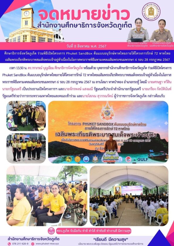 ศึกษาธิการจังหวัดภูเก็ต ร่วมพิธีเปิดโครงการ Phuket SandBox ต้นแบบอนุรักษ์หาดไทยภายใต้โครงการรักษ์ 72 หาดไทย เฉลิมพระเกียรติพระบาทสมเด็จพระบาทสมเด็จพระเจ้าอยู่หัวเนื่องในโอกาสพระราชพิธีมหามงคลเฉลิมพระชนมพรรษา 6 รอบ 28 กรกฎาคม 2567 8 สิงหาคม 256728 สิงหาคม 2024Natthawan SangSawangข่าวสารทั้งหมด, ภารกิจผู้บริหาร FacebookFacebook