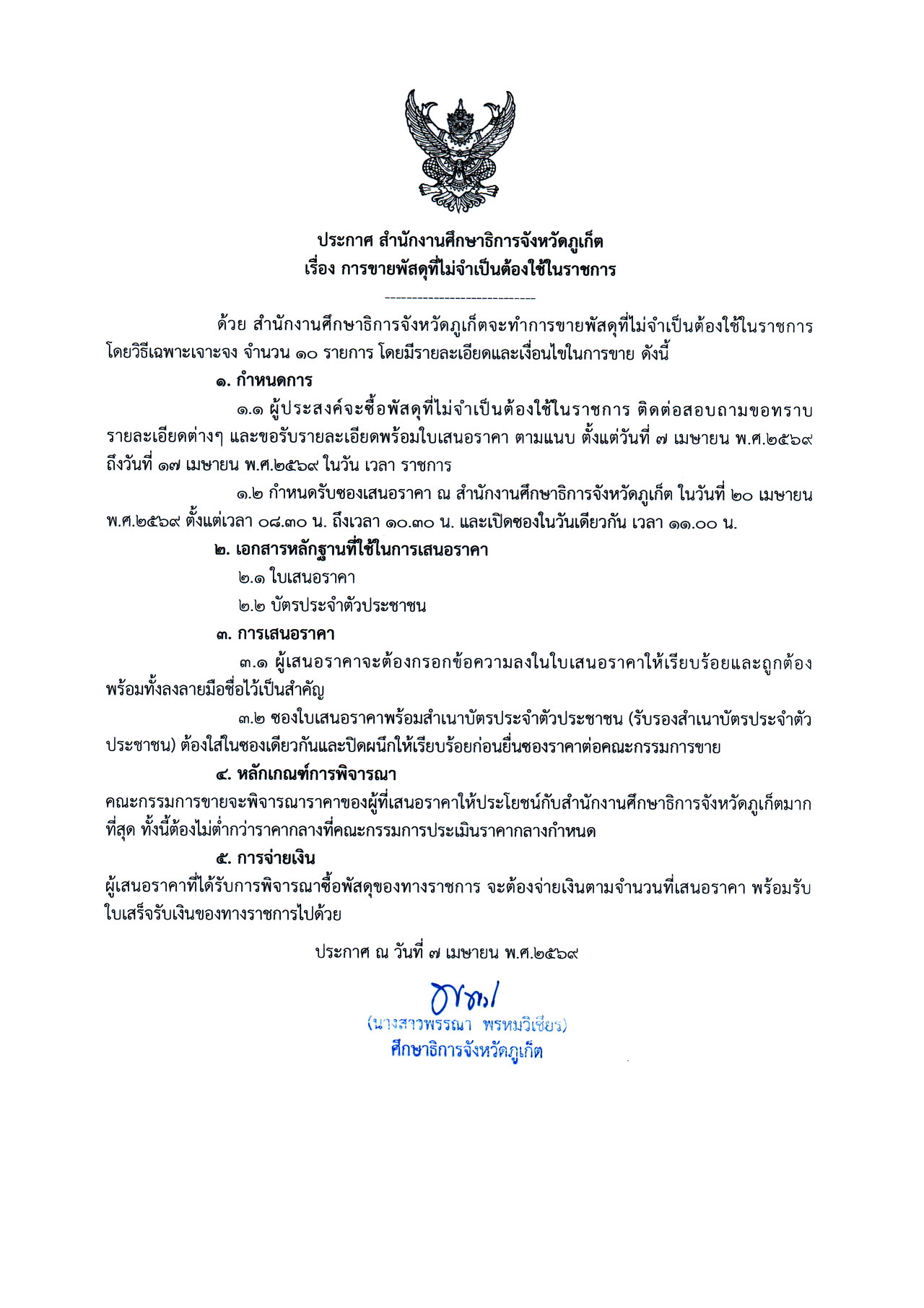 สำนักงานศึกษาธิการจังหวัดภูเก็ตประกาศขายพัสดุที่ไม่จำเป็นต้องใช้ในราชการ โดยวิธีเฉพาะเจาะจง จำนวน 10 รายการ 7 เมษายน 256910 เมษายน 2026jwpkข่าวประกวดราคา, ข่าวสารทั้งหมดพัสดุ ดูและดาวน์โหลดประกาศในรูปแบบไฟล์ PDF คลิกที่นี่ จิรวัฒน์ เพชรกุล/ประชาสัมพันธ์ FacebookFacebook